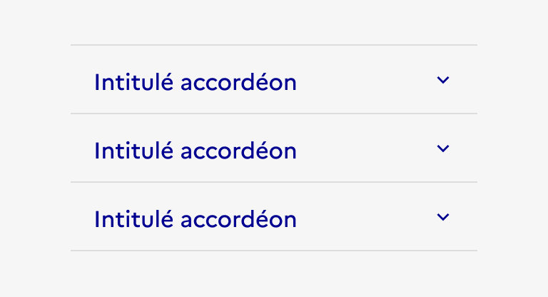 La largeur de l’accordéon s’adapte à la taille de son conteneur. Toutefois, il est recommandé de ne pas excéder une largeur de 8 colonnes, s’agissant d’un composant de mise en forme de contenu.