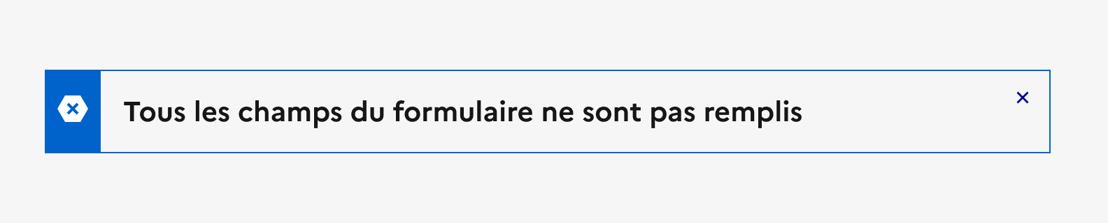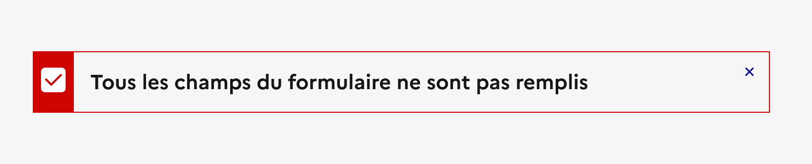 Utiliser l'alerte erreur lorsqu’il y a plusieurs erreurs dans un formulaire ou des erreurs bloquantes à remonter à l’usager.