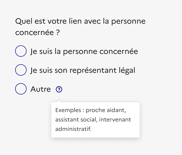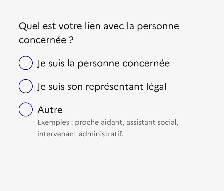- Accompagner les boutons radio d’un texte d’aide pour clarifier la nature du contenu attendu lorsque nécessaire. Si cette information est essentielle, éviter de la masquer dans une infobulle.