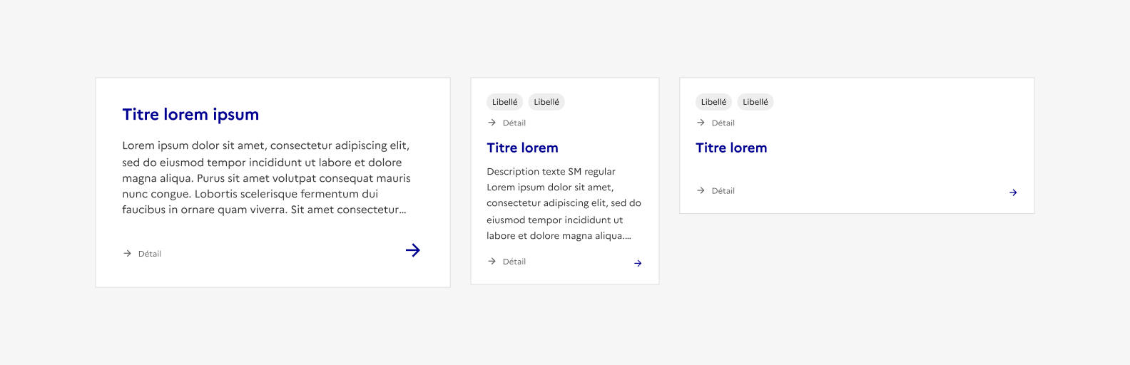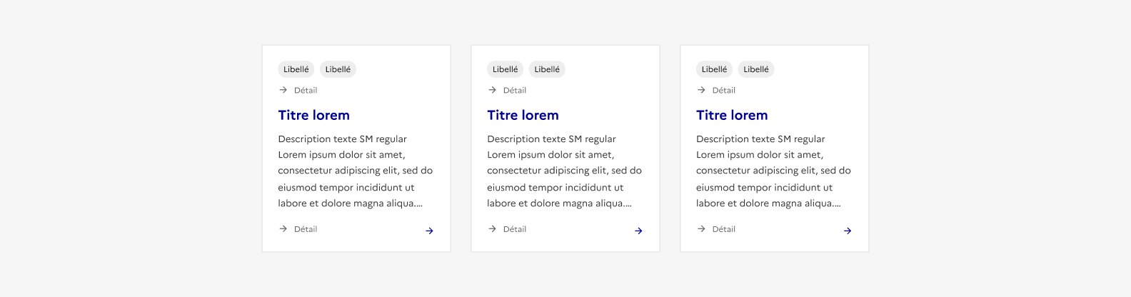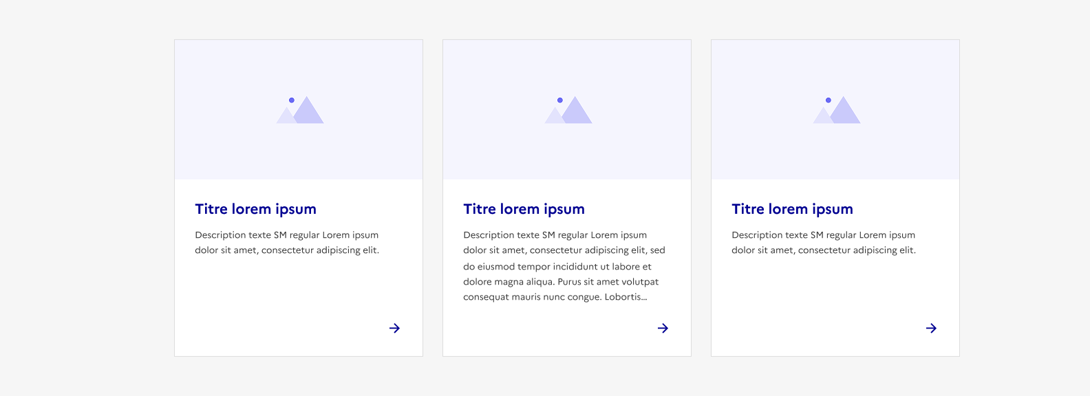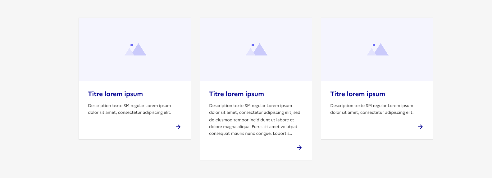 - Harmoniser la hauteur des cartes par ligne, en prenant la plus importante comme référence, lorsque celles-ci sont disposées au sein d’une liste. Au sein d’une grille (plusieurs lignes), les hauteurs peuvent varier mais l’ensemble doit garder une cohérence visuelle.