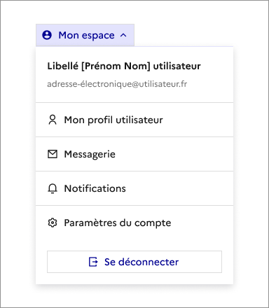L’en-tête connectée est une déclinaison de l’en-tête et propose un menu déroulant contenant des options parmi lesquelles un usager peut naviguer vers les pages liées à son compte.