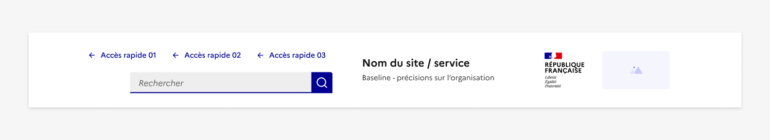 En version mobile, l’en-tête se compose d’une zone haute intégrant les éléments obligatoires liés au bloc marque. Le bloc marque suit les mêmes règle de composition que pour le desktop et doit respecter la charte de marque de l'État .