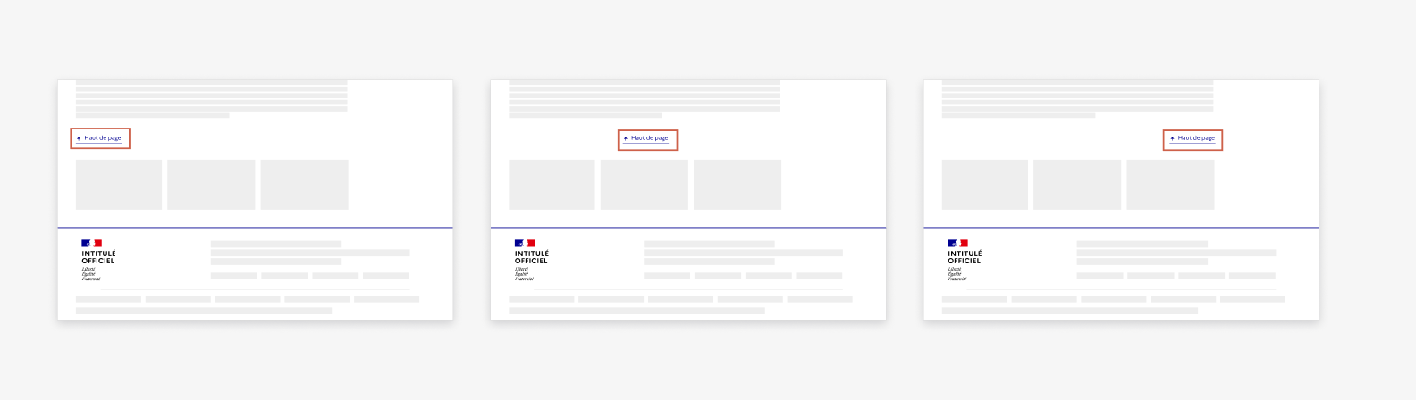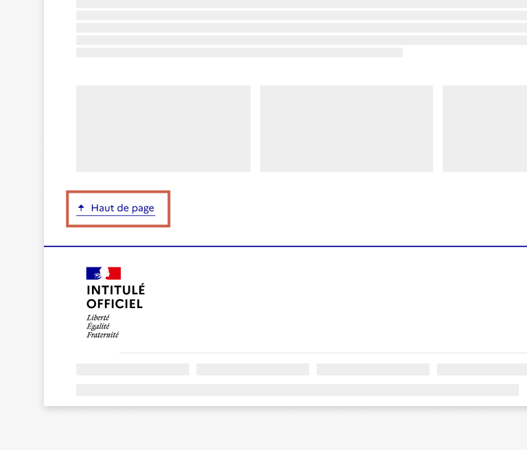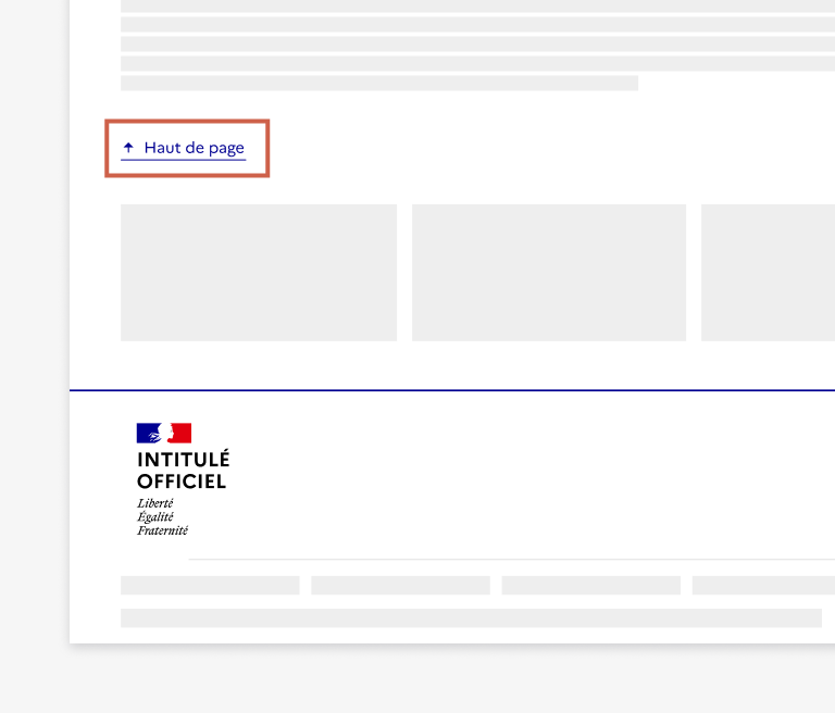 - Placer le retour en haut de page à la fin du contenu de la page, avant le pied de page. Si il y a des blocs de poursuite de lecture (exemple : liens vers d’autres articles), il est conseillé de placer le retour en haut de page avant ces blocs.