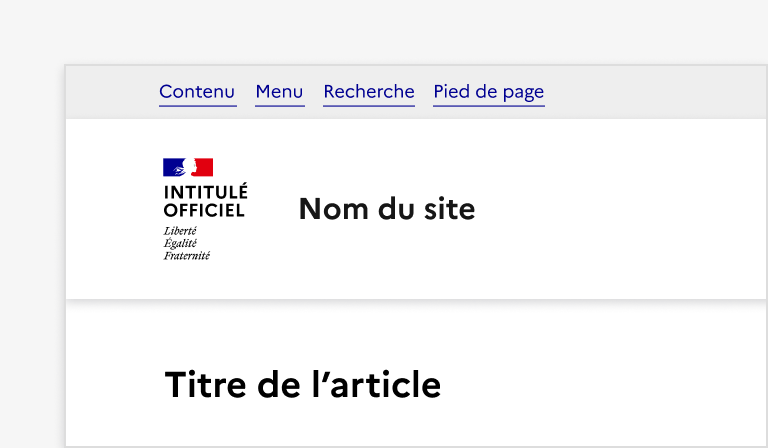 - Choisir les liens affichés en fonction des éléments clés présents dans le site. Le lien minimum est “Accéder au contenu”, les autres liens doivent être choisis au cas par cas, en fonction des fonctionnalités/zones clés.