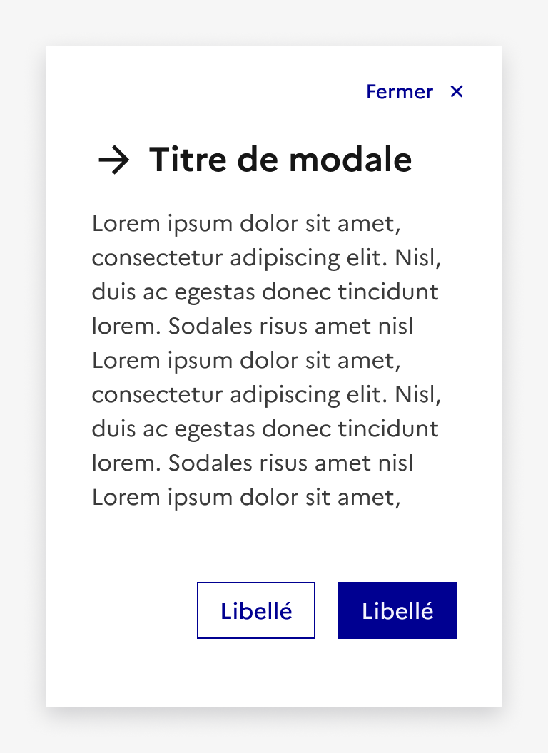 La modale est un élément de mise en forme de contenu permettant de concentrer l’attention de l’usager exclusivement sur une tâche ou un élément d’information, sans perdre le contexte de la page en cours.