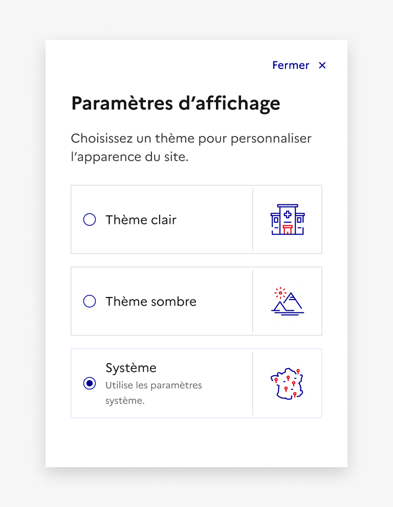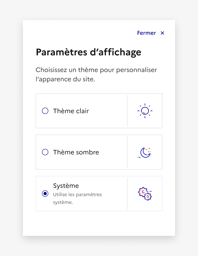Les paramètres d’affichage représentent un parcours simple permettant à l’usager d’interagir avec l’interface afin de modifier le thème d’un site.