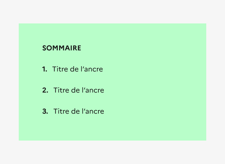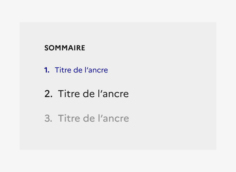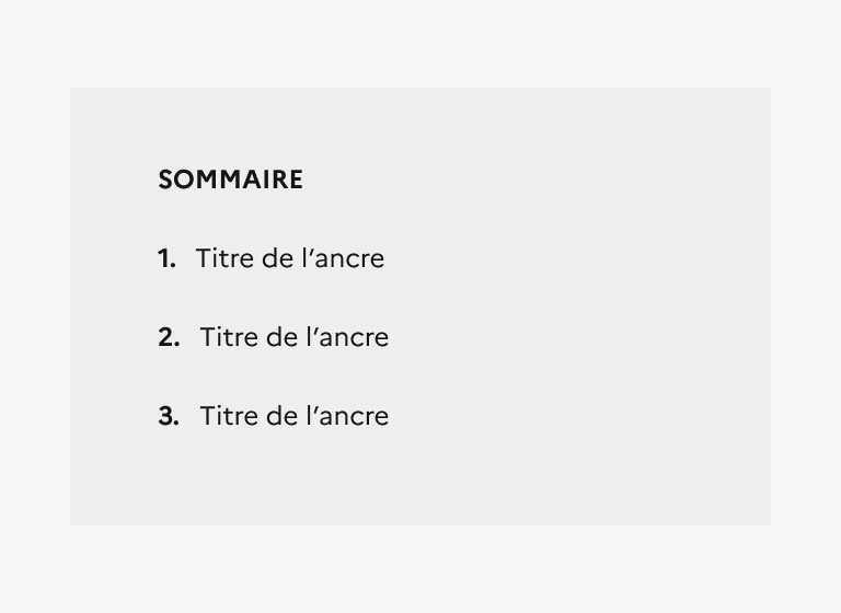 Le sommaire est un système de navigation secondaire présentant une liste d’ancres placée au-dessus du contenu correspondant.