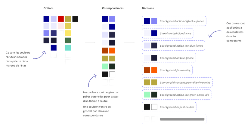 La palette de couleurs du Système de Design de l'État n’est pas utilisée à l'état brut dans les composants : elle sert de fondation à une nomenclature contextuelle, exprimée par des design tokens de décision.