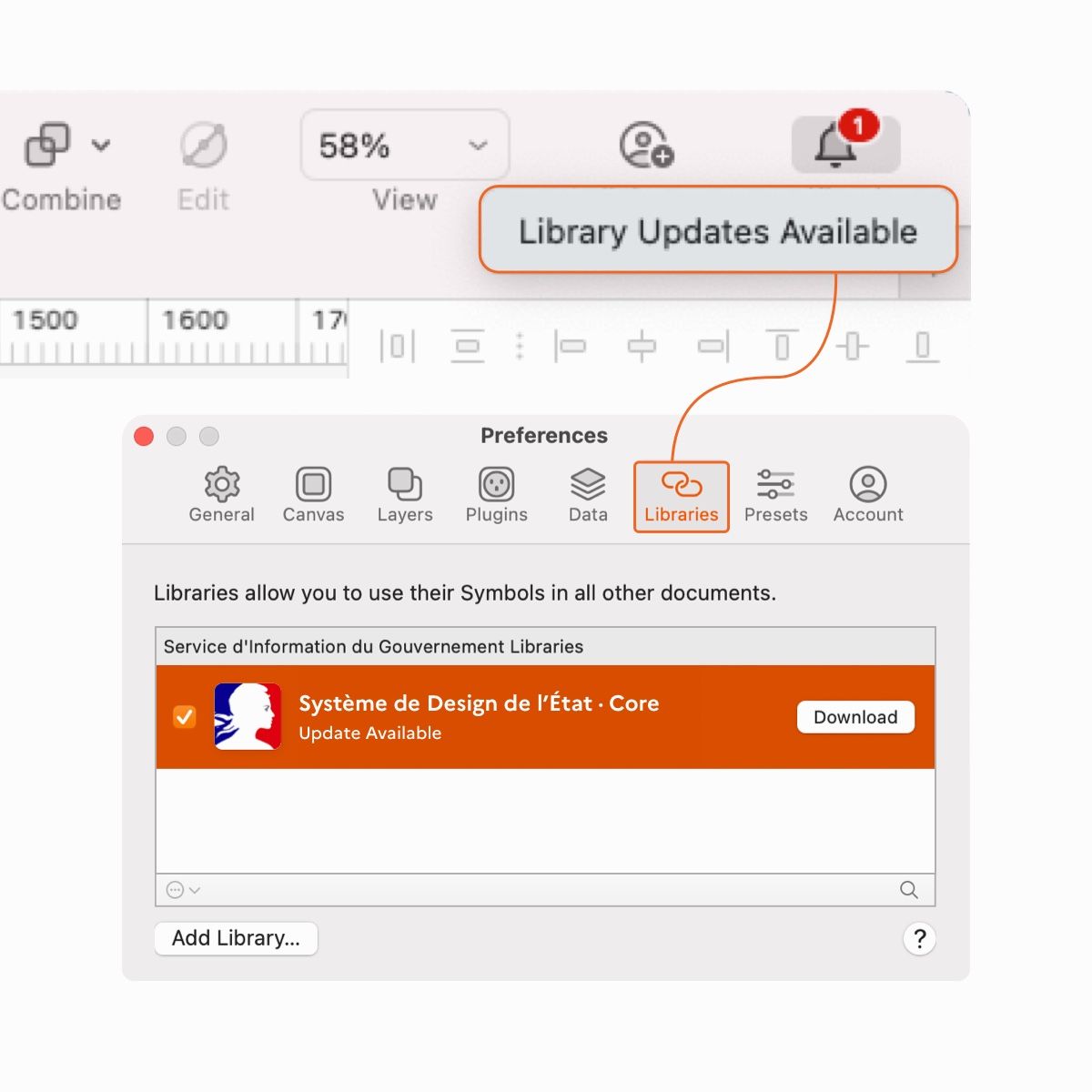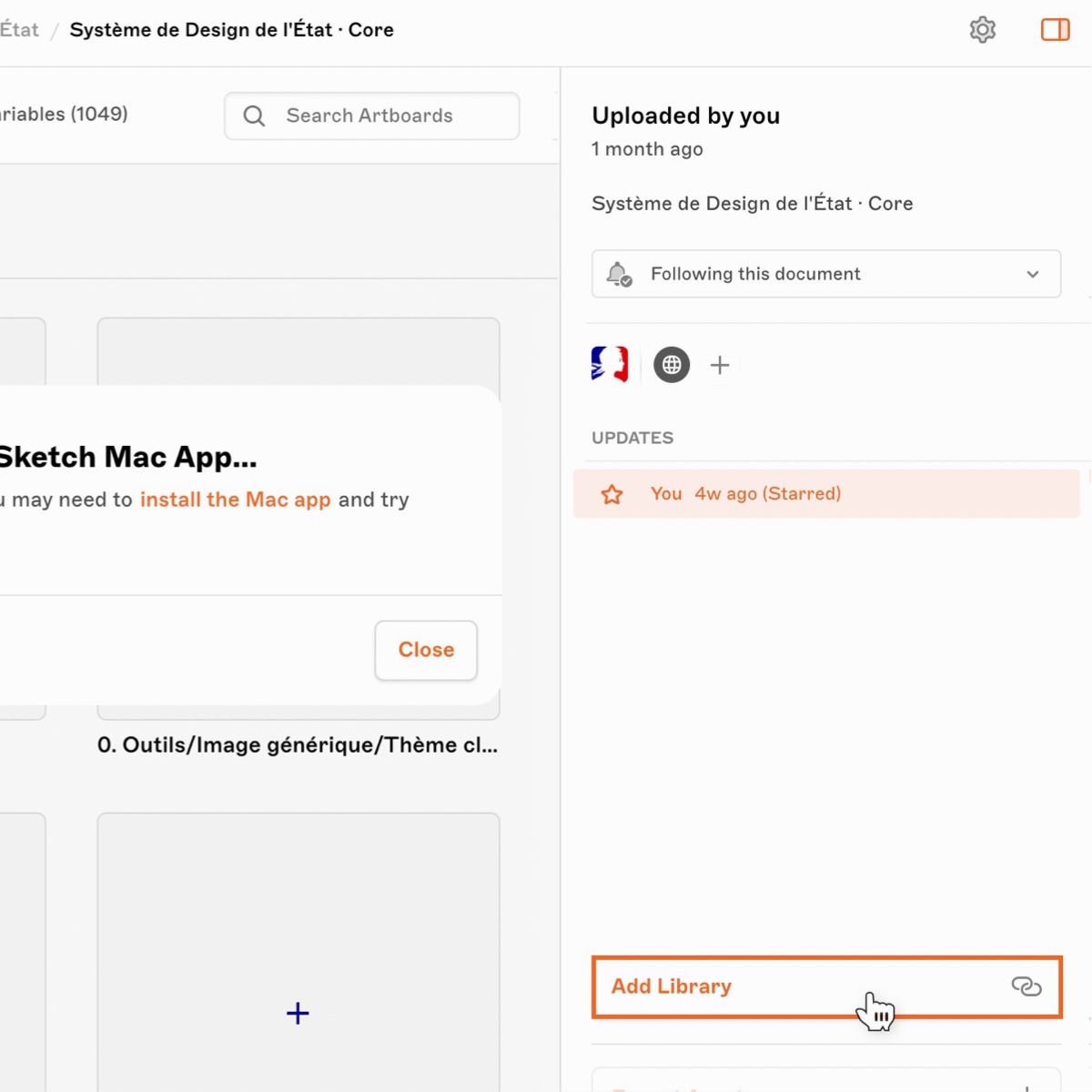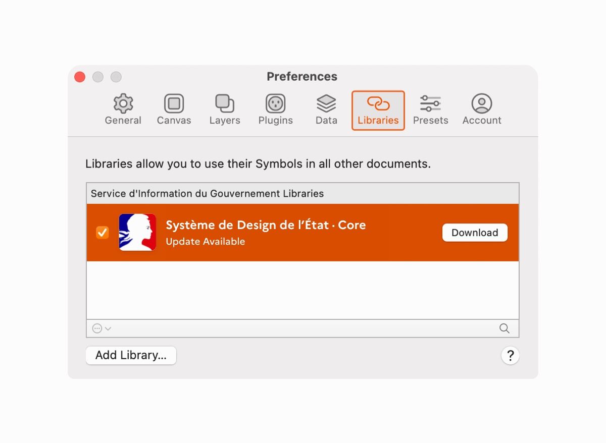 Ajouter la libraire « Système de Design de l’État · Core » via Sketch Cloud. Pour ce faire, il vous suffit de vous rendre sur ce lien suivant : Ajouter la librairie via Sketchcloud et de cliquer sur “Add Library”.